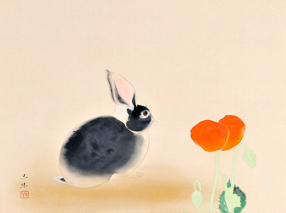 「目が楽しいから生きものを描くのが好き」と言った奥村土牛(とぎゅう)は、動物を題材にした作品を数多く残した。丸くふわふわとしたさまが可愛らしい「兎(うさぎ)」は、土牛58歳ごろの作品。他に、乳を飲む子鹿と母鹿を描いた「鹿」(68年)や、85歳の作「シャム猫」(74年)などが並ぶ。猫を描いたものでは、小林古径や川合玉堂の作品も。