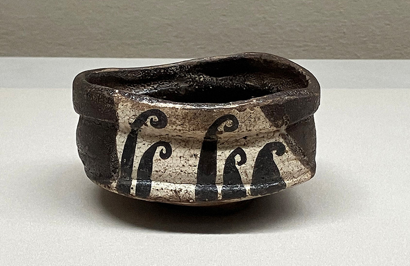 入江コレクション(展示室3・4)は、中国の新石器~清時代の多彩な酒器が並び、時代や生産地による違いを楽しめる。中国や韓国、日本などの茶道具を中心とした松惠コレクション(展示室6)からは、重要美術品の茶席の掛け軸「石山切(伊勢集)」(1112年ごろ)などがお目見え。桃山時代の「黒織部波文茶碗」は当時のアバンギャルド(前衛)だ。「鈴木正男コレクション」(展示室7)からは、朝鮮陶磁の研究者で、柳宗悦らと共に韓国陶磁の魅力を日本に紹介した浅川伯教さん(故人)旧蔵の韓国陶磁や関連資料を展示。朝鮮の窯跡の記録図など貴重な研究資料も見られる。浅川さんらが評価した李朝の白磁壺「満月壺」は、シンプルで力強い形状の美しさが際立つ。