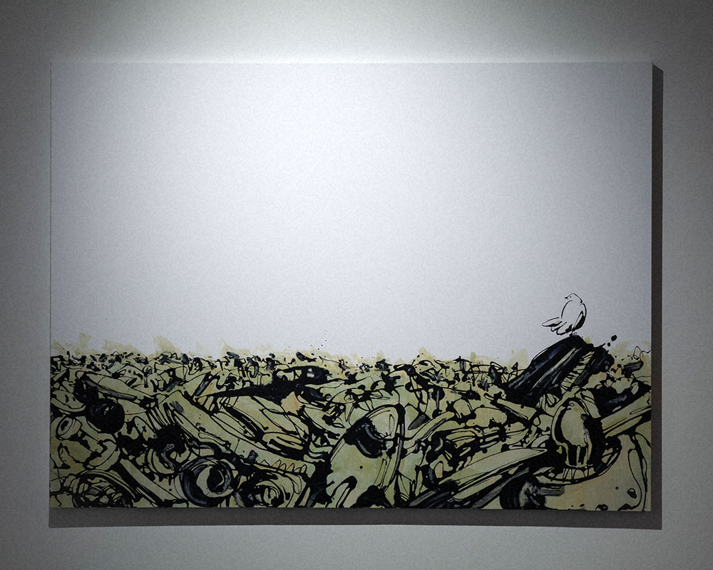 20年に始まったコロナ禍で「It's So Hard」を制作した。戦闘機や銃など戦争を思わせるモチーフを重ね、白い空間はコロナを表現。花を中心に生き物や食べ物をカラフルに描いたそれまでの作品とは趣が異なる。「世の中が重たい感じだったので、画家としては記録として残したいと思いました」。とはいえ、「希望がある感じにしたい」と考え、右端にはピアノと白いハトを描いた。