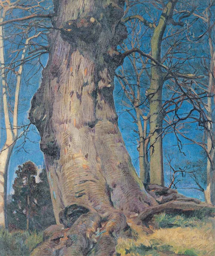 20世紀初め、日本洋画の主流は印象派風の明るい作風を目指した黒田清輝ら「新派」だった。それに対し、「旧派」と呼ばれる重厚な画風の流れをくんだ鹿子木は時代に迎合することなく、晩年までリアリズムの信念を貫いた。展示の終盤に飾られている「木の幹」は澄んだ青空の下、一本の巨大な落葉樹の幹がそびえる。圧倒的な存在感を放つ姿は、「不倒」の画家の自画像にも見える。4月5日まで。