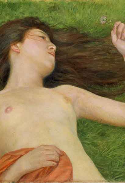 日本のヌード模索花咲く草原に仰臥(ぎょうが)する日本人と思わしき裸婦。うつろなまなざしで見つめる先には、左手でつまんだ一輪のかれんな...