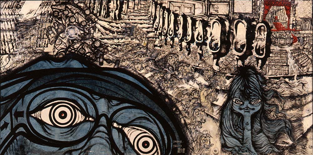 60年の安保闘争を「敗北」と受け止めた後、作風は内省的なものへと変化。政治的な出来事に代わって主題となったのが、記憶の中の風景だった。浜松・三方原台地と重なる荒涼とした土地。自宅に残された空襲の砲撃跡を思わせる穴。戦争の記憶と結びついたモチーフは、半世紀以上を経て、90歳を前に描き始めた「戦争記憶絵図」にも登場する。過去の時間を現在の画面に構成していく手法を画家は「方法論的なモンタージュ」と捉えていた。