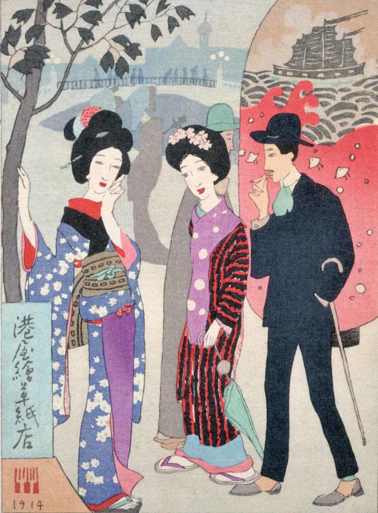 そうした商品を販売するため、東京の日本橋に港屋という店を開いた。彼の版画「港屋絵草紙店」はそれを記念するような作品。洋風の橋や建築が並ぶモダンな街を行き交うのは、和装や洋装の華やかな男女。右側にみえるのは、港屋の入り口にかかっていた大きな提灯(ちょうちん)である。