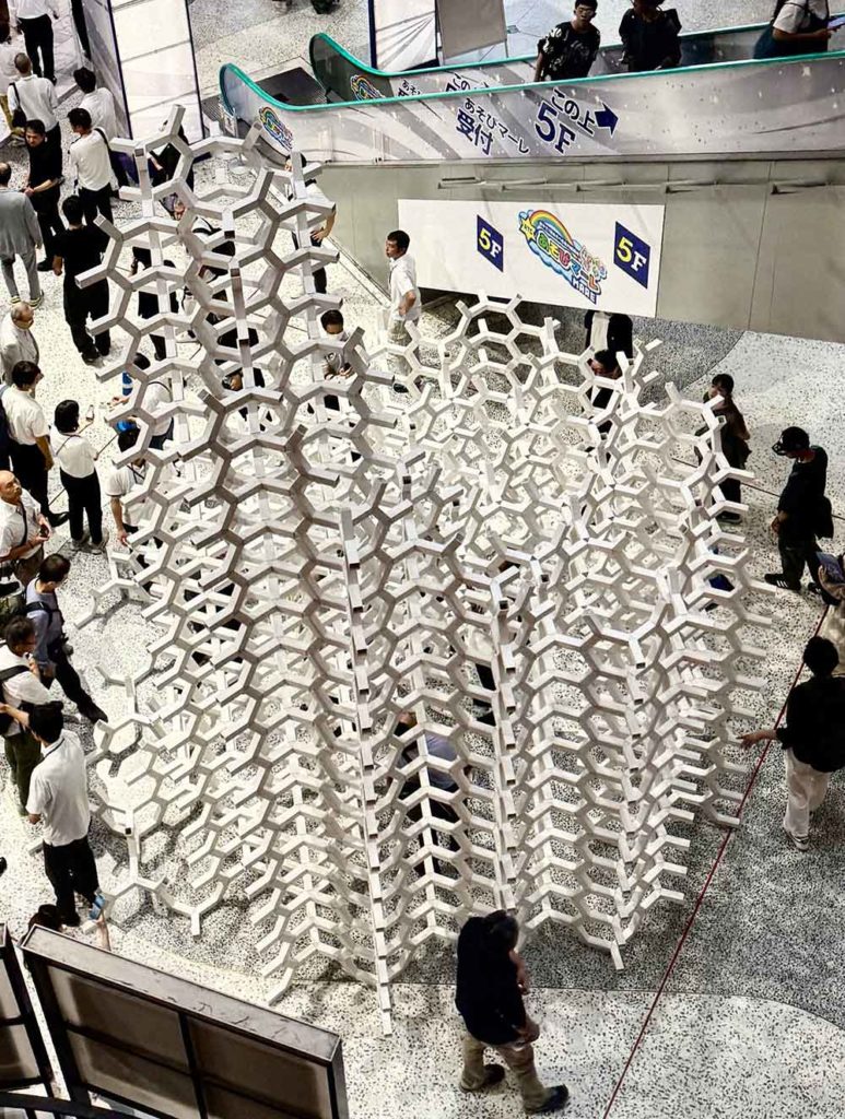 全国から集まった約40人の学生は10班に分かれ、6月から万博会場でリサーチを始め、専門家らのアドバイスを受けながら構想を練った。9月8日からは現地で合宿し、制作を進めた。14日には会場で公開プレゼンテーションが開かれ、美術評論家の建畠晢さん、建築家の藤本壮介さん、和紙デザイナーの堀木エリ子さんら21人が審査を実施。ラタン素材を使った6班の「延」が最優秀賞に選ばれた。