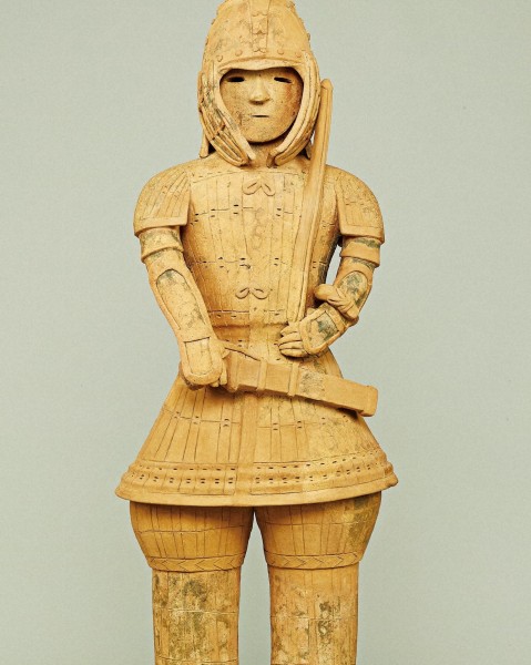 頭から足元まで武具を着用する、完全武装した武人の埴輪(はにわ)。...