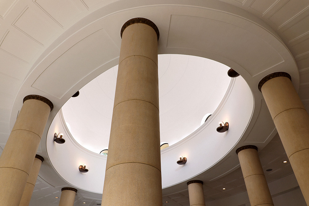 建物は柔らかい曲線を描く楕円(だえん)の形状で美術的に優れ、かつデザイン性にも富む。中央ホールの中心にはブロンズの明治天皇騎馬像が鎮座する。ここでも円柱がその周囲を囲むように配置され、荘厳さを醸しており、その上に一回り小さい楕円の天井がある。像の台座からの天井高は、約8・5㍍にもなる。