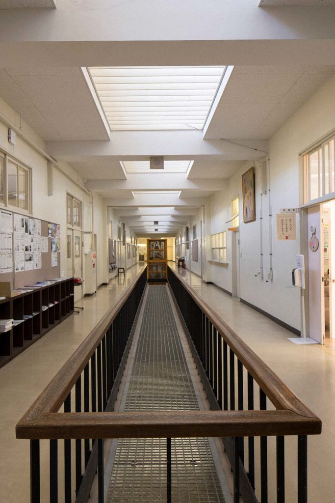 「生徒が健やかに教育を受けられるように」と、自然光を取り込む設計が随所に見られる。例えば2階の渡り廊下(約300㍍)にも太陽光が注ぎ込み、各校舎をつなぐ。象徴的なのは中廊下だろう。廊下の中央に壁と平行した大きなスリットを設け、すりガラス状の天井から入る太陽光が階下にまで届く。現在は塞がれているが、ドーム状の明かり取りもある。