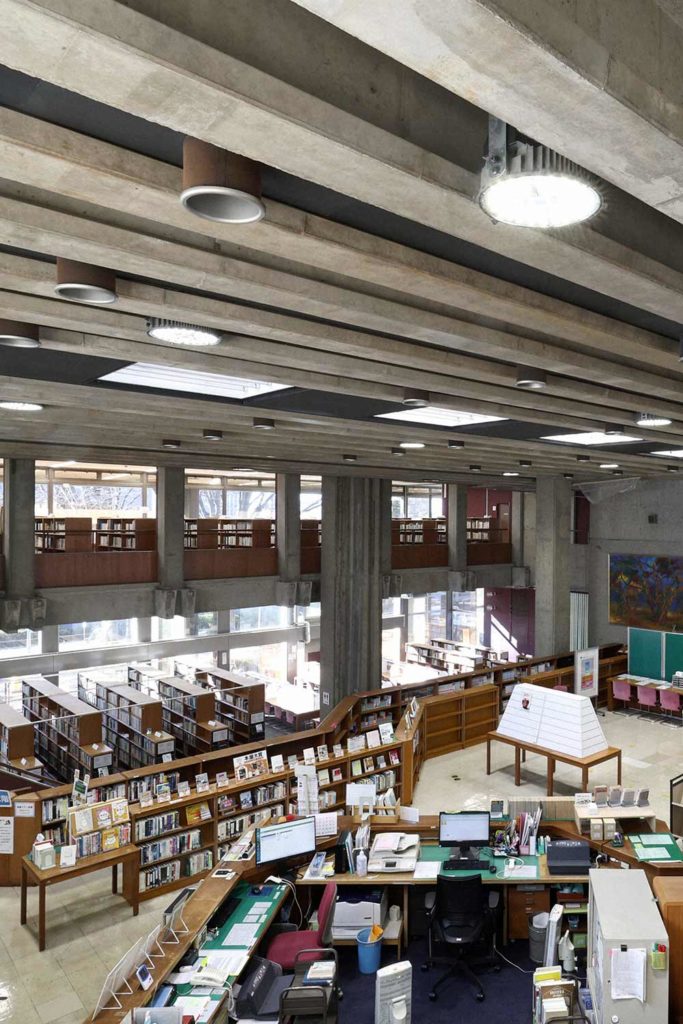 1973年に完成し、地下1階、地上8階、塔屋2階建ての構造。中央には書庫棟、その両翼には閲覧・学習室棟が建つ。シンメトリー(左右対称)の構図だ。中に入ると開放的な空間が広がる。見上げると、狭い間隔でいくつもの梁(はり)が並ぶ「ジョイストスラブ」が目に入る。