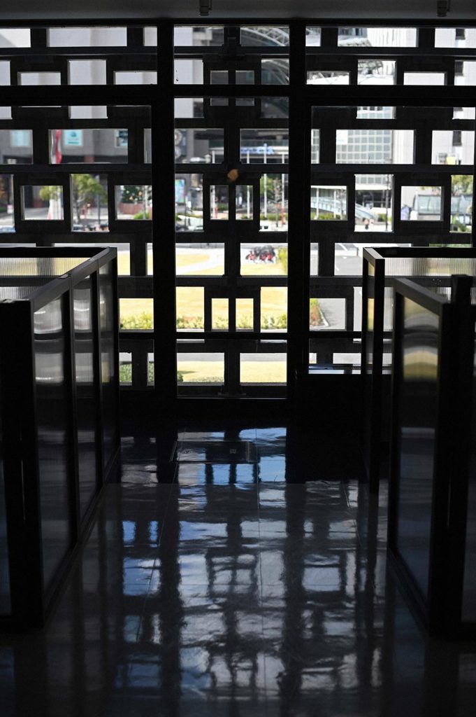 エントランスホール1階の受付(右下)と本館と南館を結ぶ渡り廊下=佐藤賢二郎撮影