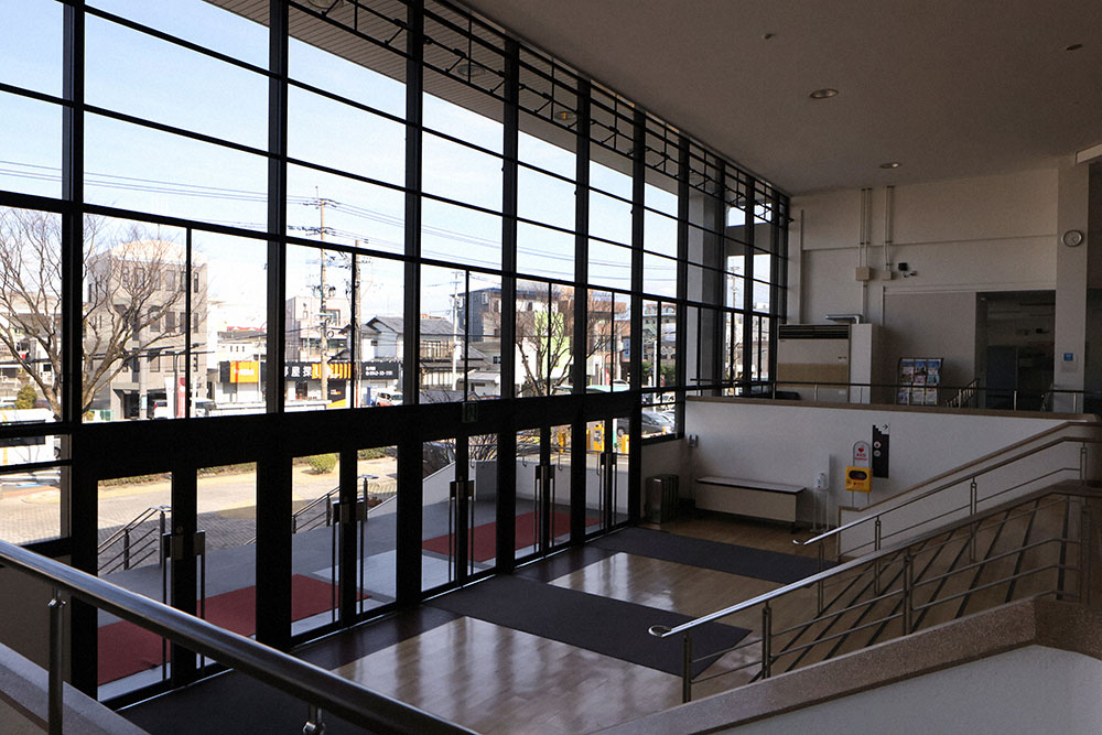 福岡県久留米市の石橋文化ホールは、簡素で美しいデザインが特長だ。玄関は全面ガラス張りで、変わりゆく街の風景を格子状に切り取っている。