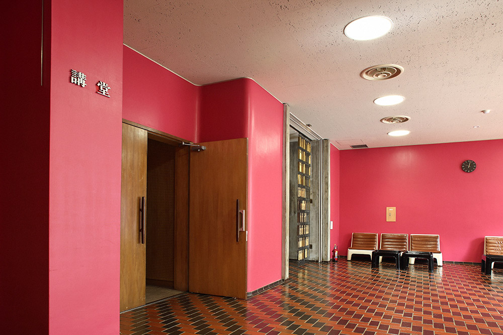地下1階には講堂があり、入り口の壁面は前川いわく「元気になる赤」で彩られている。やや派手な色合いだが、不思議と落ち着いた印象を与える。