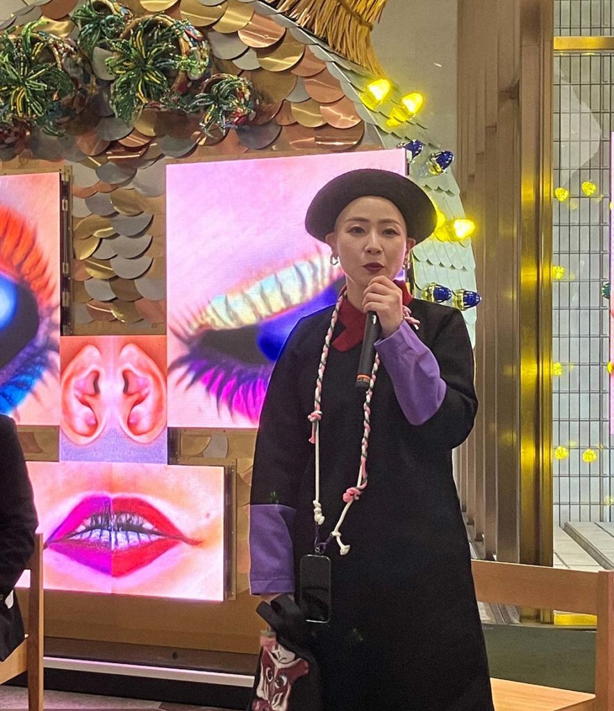 本展のために制作した最新作「タイマツ」は料理がテーマ。画面に登場する料理のメインは豚肉で、火を通さないと食べられない。そのままでは受け入れられないものを、一手間かけて受け入れられるものに変化させることに着目した作品だ。鏡の反射を使い、万華鏡のような映像世界が展開される。